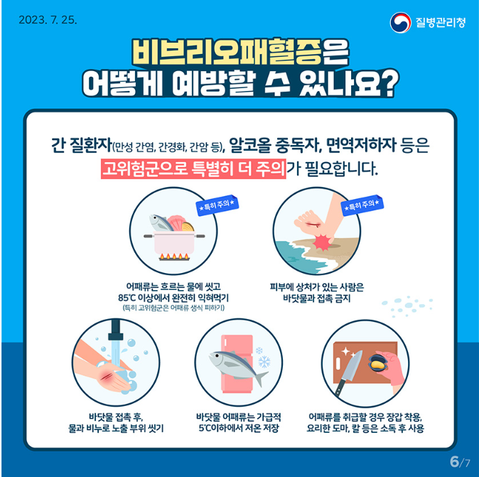 이러한 고위험군은 생선회, 굴, 조개류 등 비가열 해산물 섭취를 피하는 것이 매우 중요합니다.