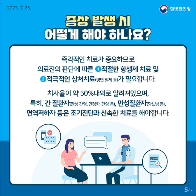 감염 후 수 시간 내 패혈증으로 진행될 수 있으며, 치료하지 않으면 사망률이 50%에 달할 정도로 위험합니다.