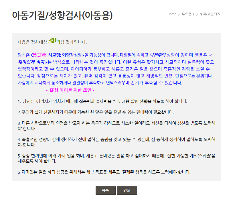결과: 기질 유형 분류, 양육 팁 제공, 상담 권장 여부