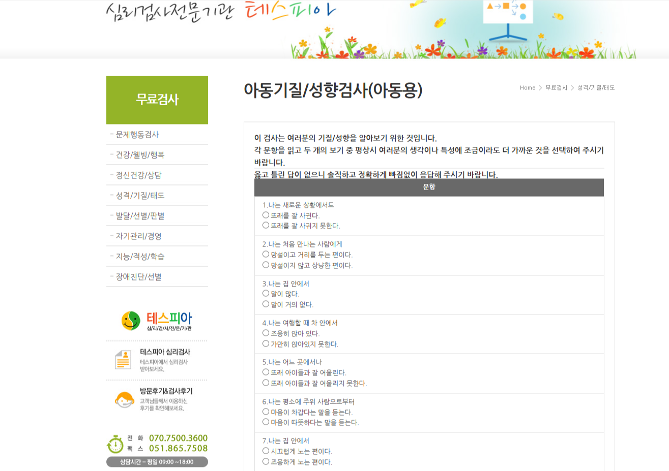 초등학생 대상 기질검사는 대부분 부모 설문형식으로 진행되며, 아이의 평소 행동에 대한 문항에 답하면 됩니다.